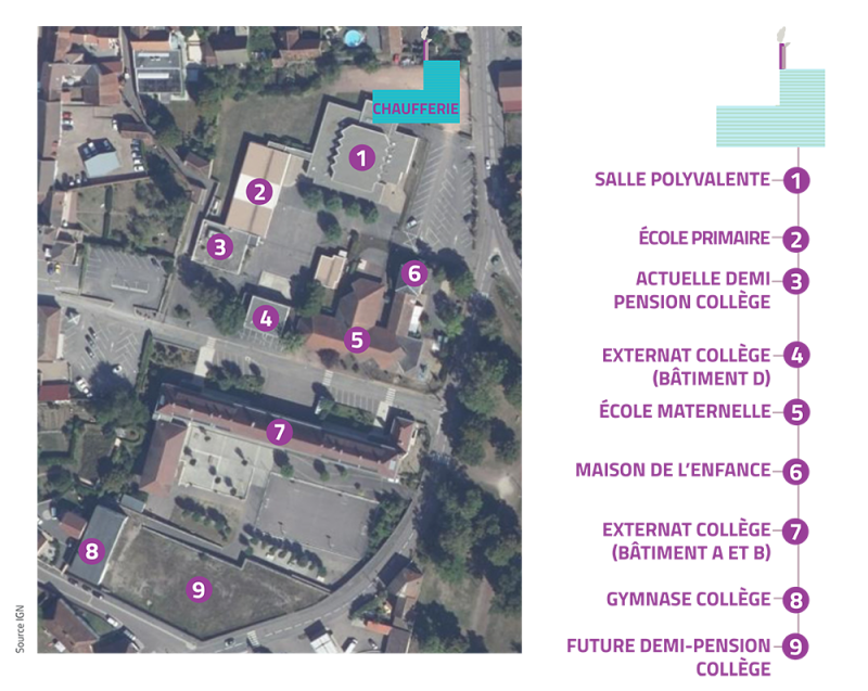 • le Département avec le collège (externat du collège [bâtiment A et B], gymnase et future cantine)